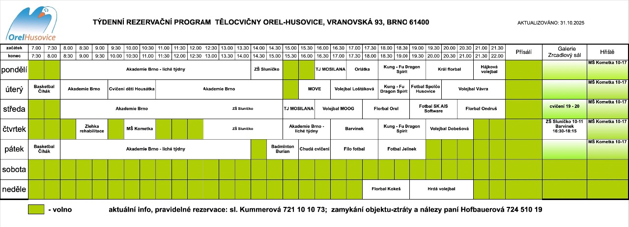Upozornění: Orel Husovice funguje jako školské zařízení. Pravidelný provoz je tedy od září do konce června. Mimo toto období je provozní doba pouze na základě individuální domluvy.