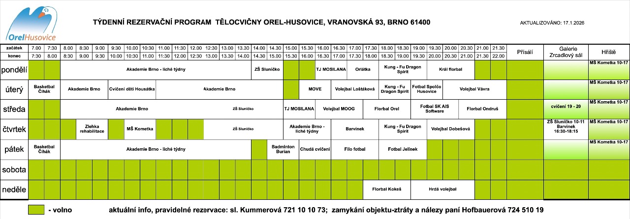 Upozornění: Orel Husovice funguje jako školské zařízení. Pravidelný provoz je tedy od září do konce června. Mimo toto období je provozní doba pouze na základě individuální domluvy.